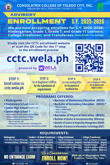 Consolatrix College of Toledo City, Inc. warmly welcomes all new and continuing students to enroll for the upcoming school year 2025–2026! Read on for more information.